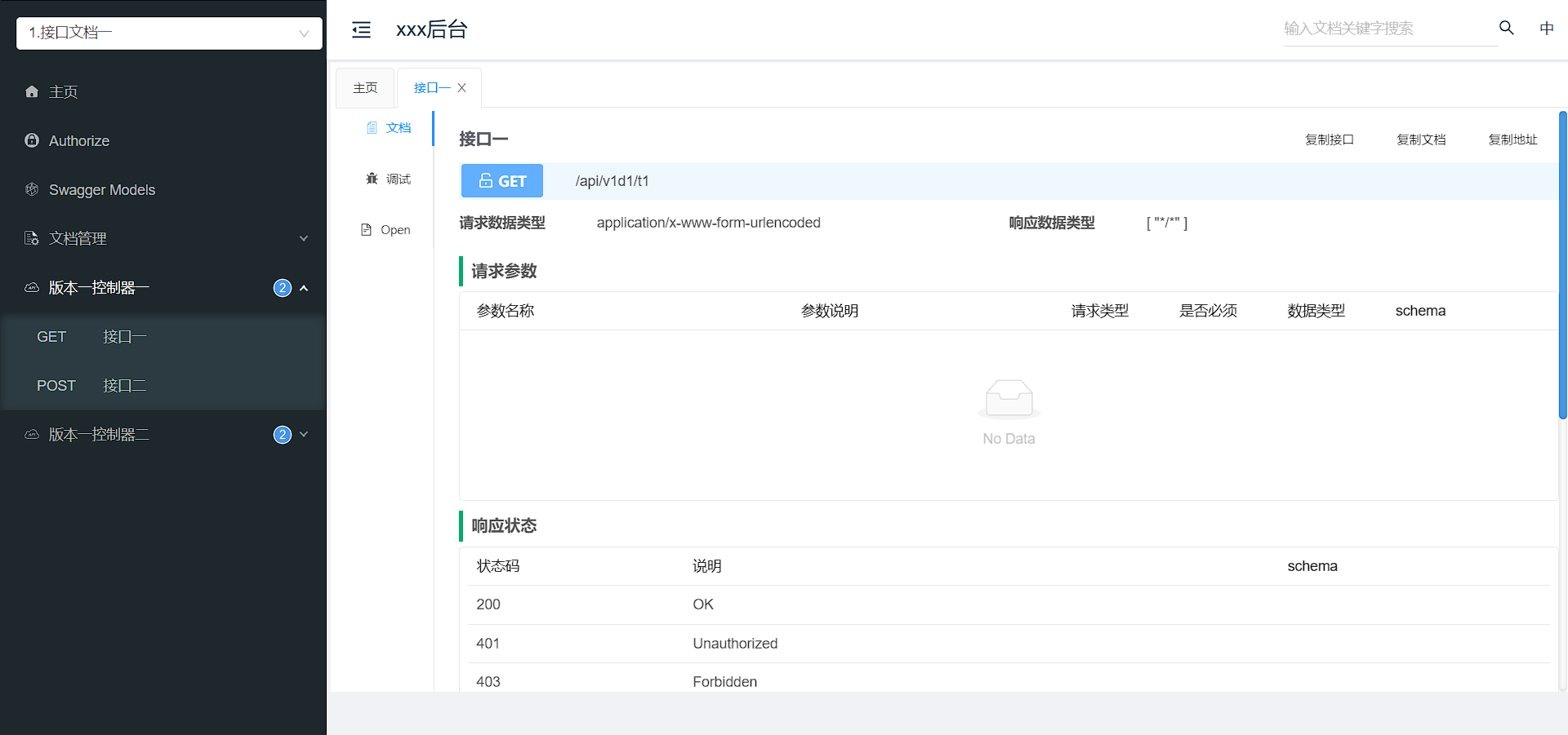 swagger: enable: true title: "xxx后台" description: "xxx后台描述" version: "1.0.0" pathMapping: /api contact: name: "xxx" email: "xxxx@qq.com" url: "https://xxxx.com" groups: - name: 1.接口文档一 basePackage: com.xxxx.controller.apiA - name: 2.接口文档二 basePackage: com.xxxx.controller.apiB